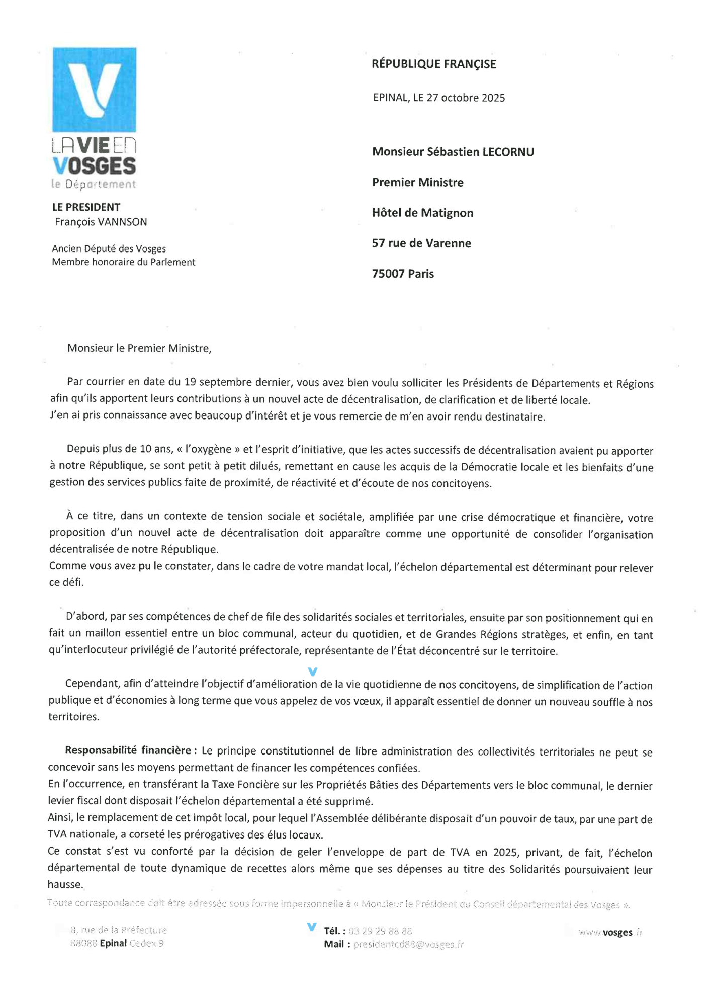 Enfin, il appelle à renouer une relation de confiance entre l’État et les Départements, notamment en réexaminant la suppression de la clause de compétence générale. Pour François Vannson, les Départements sont des collectivités responsables et doivent pouvoir agir librement au service de leurs habitants.