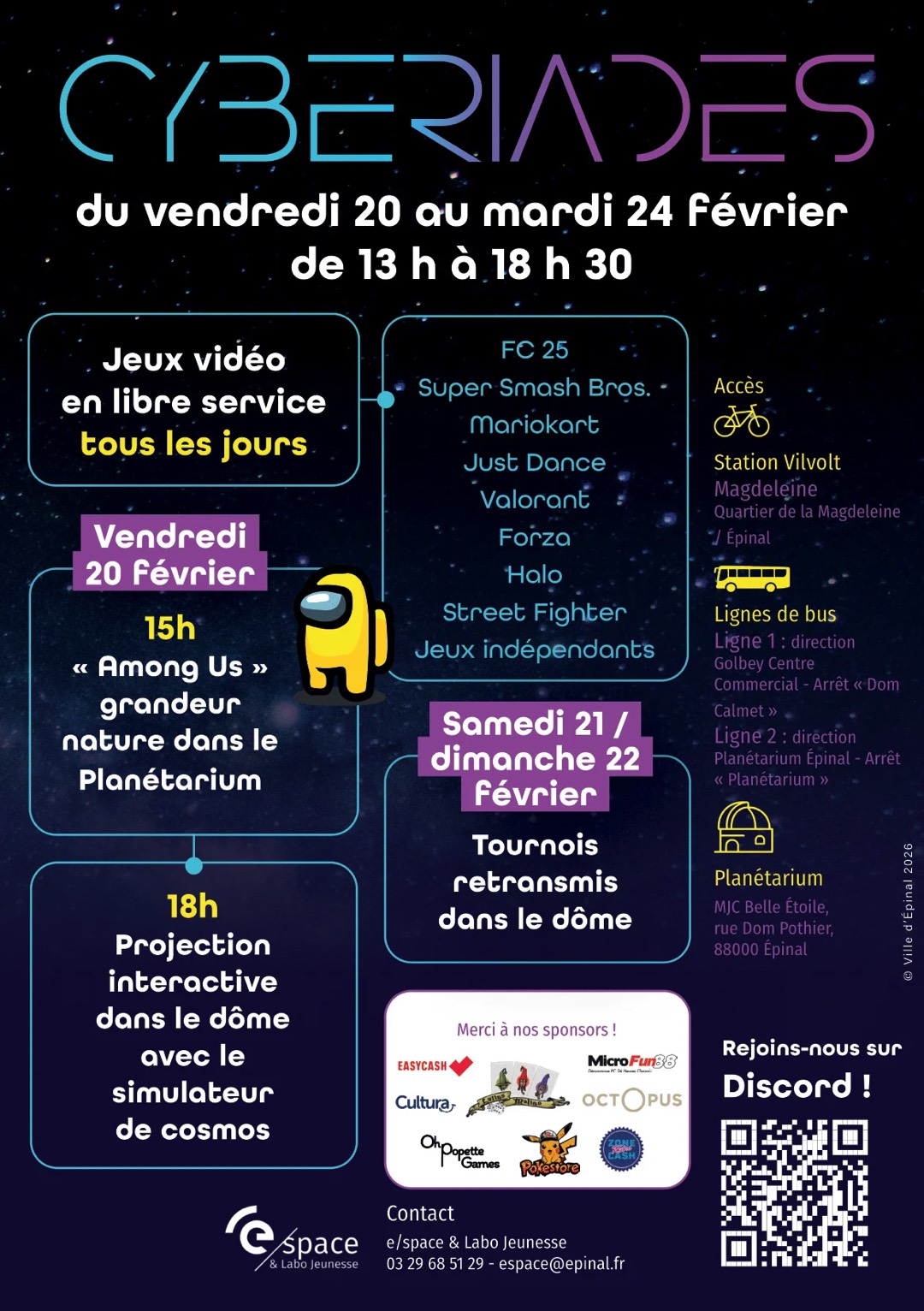 La Ville d’Épinal annonce, dans un communiqué de presse, le retour des Cyberiades avec une édition 2026 placée sous le signe du cosmos. Du vendredi 20 au mardi 24 février, l’événement investit le Planétarium d’Épinal pour proposer cinq jours d’animations gratuites autour du jeu vidéo et des usages du numérique.