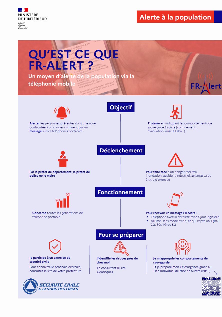 FR-Alert est le dispositif officiel d’alerte et d’information des populations. Déployé depuis juin 2022, il a pour mission de prévenir en temps réel toute personne munie d’un téléphone portable se trouvant dans une zone de danger.