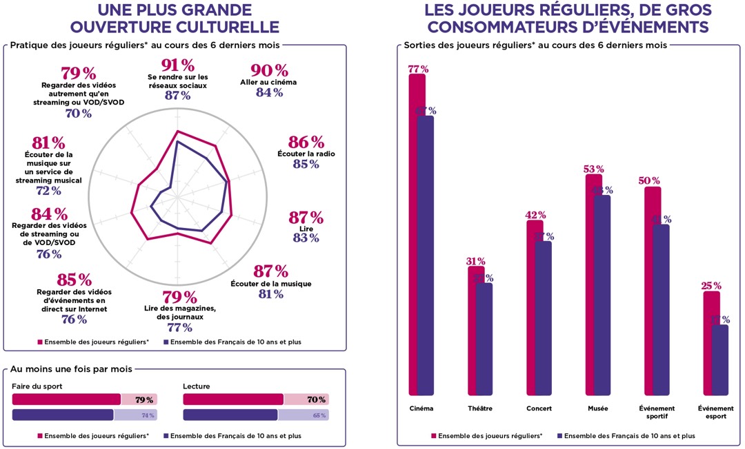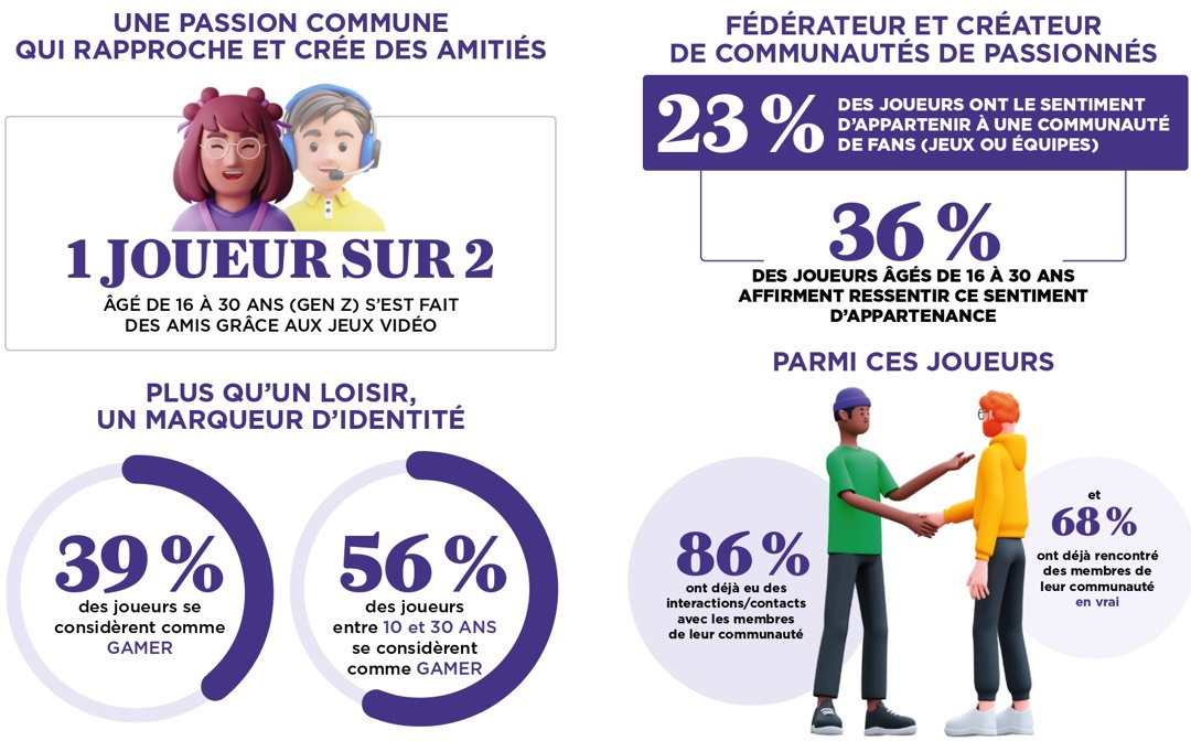 Près de quatre joueurs sur dix se considèrent comme « gamer », une identité qui n’est plus réservée aux jeunes générations. L’appartenance à des communautés de fans, les échanges sur Internet et les rencontres dans la vie réelle renforcent le sentiment d’une culture partagée. L’étude montre également que l’image du jeu vidéo est désormais très positive, reconnu comme innovant, éducatif et porteur de lien social.