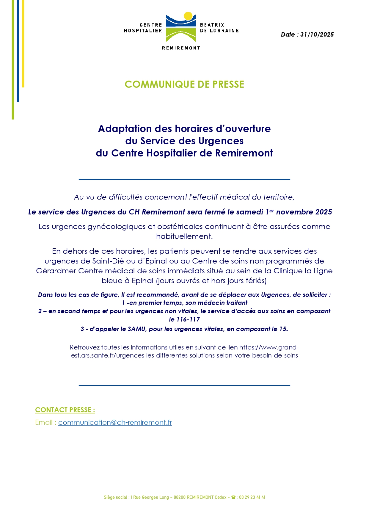 Le Centre Hospitalier de Remiremont verra donc son service des Urgences suspendu pour ce samedi 1er novembre et seuls les urgences gynécologiques et obstétricales continueront à être assurées.