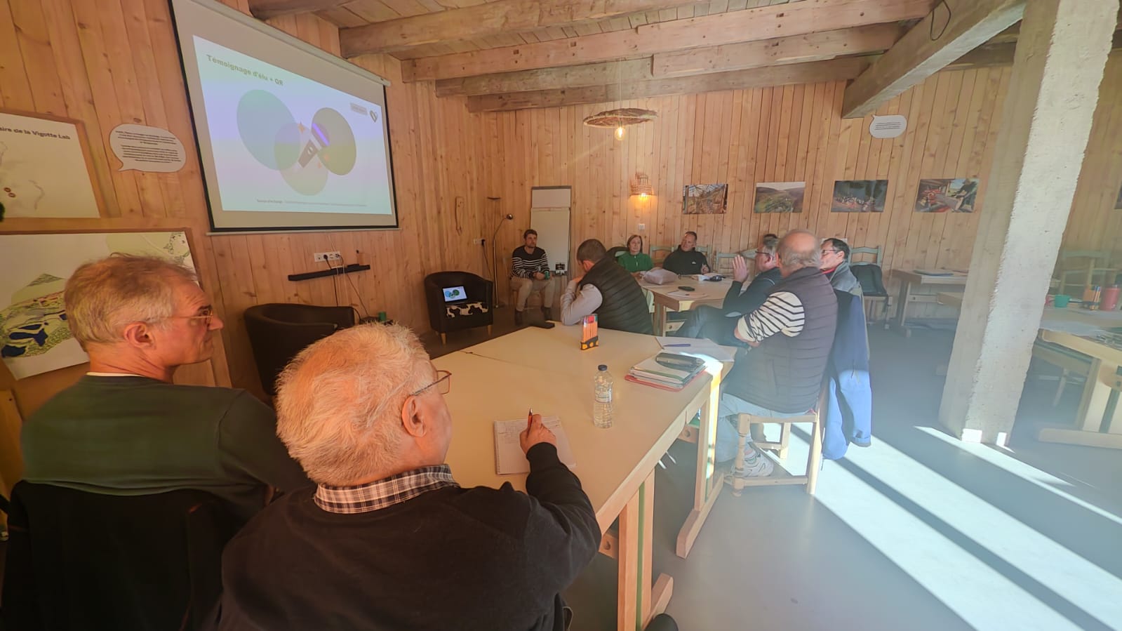 L’après-midi s’est poursuivie en extérieur, avec la visite de sites pilotes menés par La Vigotte Lab : restauration de zones humides, plantations de haies bocagères, régénération de ruisseaux, permaculture et gestion forestière concertée. Les participants ont pu confronter leurs expériences et réfléchir ensemble à des solutions concrètes pour leurs communes.