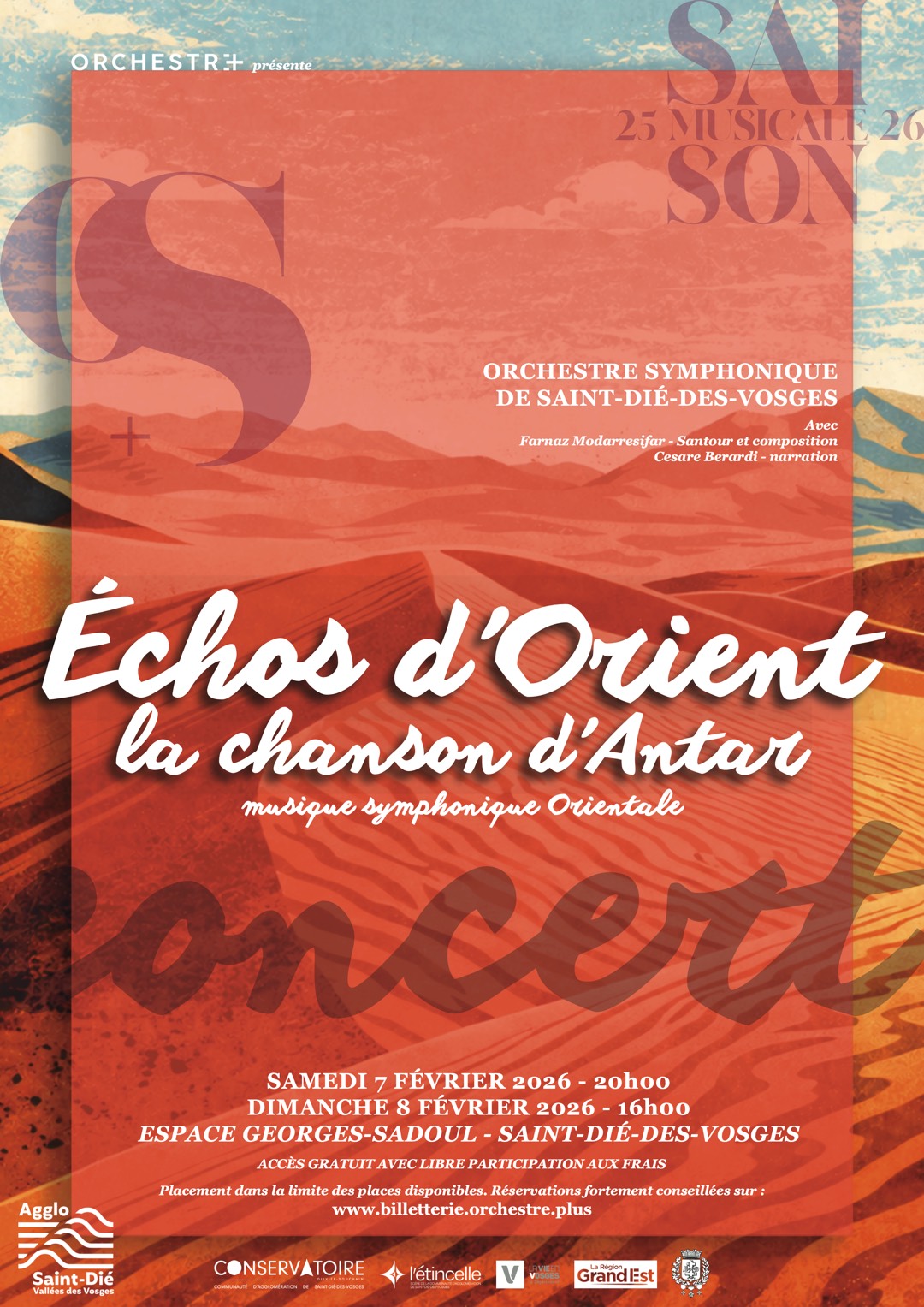 L’Orchestre symphonique de Saint-Dié-des-Vosges propose deux concerts autour du programme « Échos d’Orient – La Chanson d’Antar », samedi 7 février à 20h et dimanche 8 février à 16h, à l’Espace Georges-Sadoul. Ce concert, présenté dans un communiqué, invite le public à un dialogue musical entre Orient et Occident, mêlant œuvre romantique et création contemporaine.