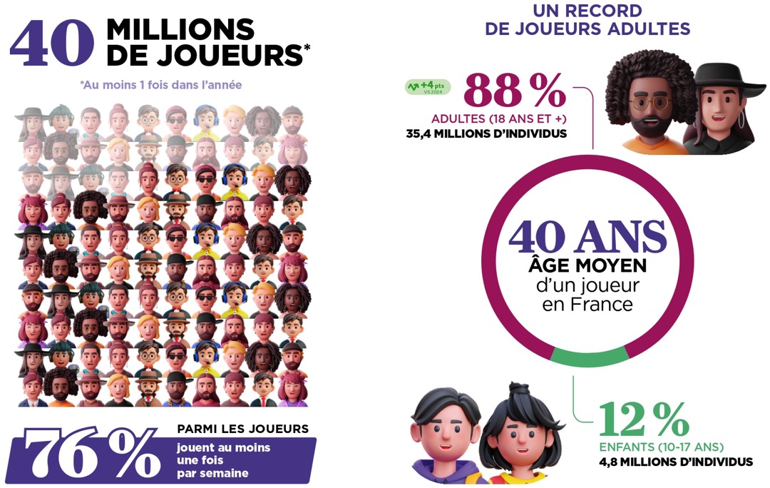 Selon l’étude SELL 2025, 40,2 millions de Français jouent aux jeux vidéo. Seniors, adultes, enfants : un loisir universel qui s’affirme comme une véritable culture, avec des joueurs réguliers de plus en plus investis.