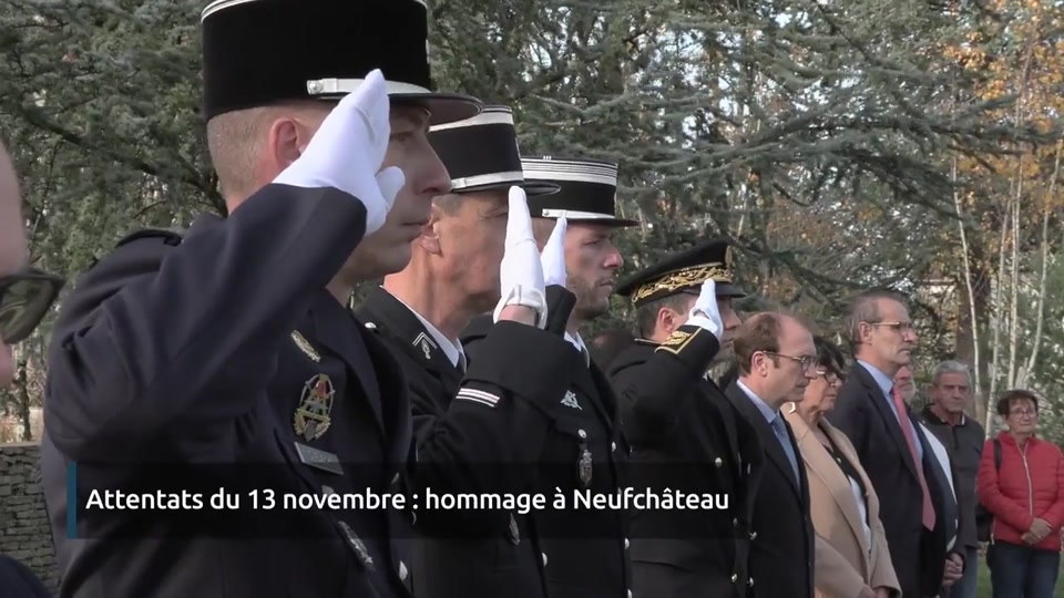 Cérémonie de commémoration du dixième anniversaire des attentats terroristes du 13 novembre 2015 de Paris et Saint-Denis à Neufchâteau avec la participation d'élèves du collège Pierre et Marie Curie.