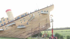 Dernières finitions pour le Titanic, qui, après son baptême de l’eau, se prépare à son baptême du feu. Cette chavande en bois à moitié naufragée, inspirée du plus célèbre des navires, a été construite par les bénévoles de l’association des Amis de l’École de Fontenoy-le-Château. Ils ont totalisé près de 1 500 heures de travail pour réaliser cette structure de 25 mètres de hauteur, l’équivalent d’un immeuble de huit étages. Située à proximité du terrain de motocross de la commune, la construction de bois s’embrasera ce samedi 9 août au soir, après un feu d’artifice, sous les yeux des quelque 5 000 spectateurs attendus pour l’occasion.
